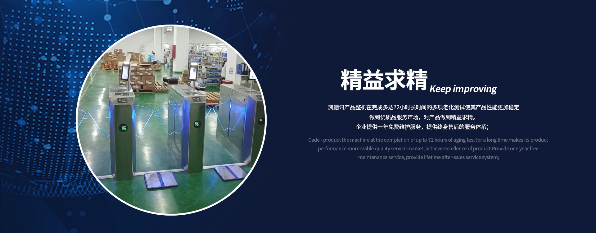 深圳市凱德訊科技有限公司成立于2003年,注冊資本500萬元,位于港珠澳大灣區(qū)的深圳市,公司集研發(fā)、生產(chǎn)、銷售電子行業(yè)防靜電門禁系統(tǒng)和民用智能通道系統(tǒng)的綜合性企業(yè)。公司擁有自主產(chǎn)權(quán)的產(chǎn)品并一直致力于ESD門禁系統(tǒng)、智能安防門禁系統(tǒng)、景區(qū)通道閘機(jī)、人臉識別閘機(jī)、消費(fèi)系統(tǒng)、智能翼閘的研發(fā)生產(chǎn)與銷售。凱德訊目前擁有多款功能齊全的系統(tǒng)軟件及多款硬件產(chǎn)品,包含成型加工、機(jī)芯研發(fā)、軟件開發(fā)等技術(shù)均為本公司自主研發(fā)、獨(dú)立完成。14年來,凱德訊一直秉承以用戶需求為核心,穩(wěn)定、實(shí)用、智能的產(chǎn)品是我們開拓市場的基石,務(wù)實(shí)進(jìn)取的精神是我們孜孜不倦的追求,全方位真誠的服務(wù)是我們對您永恒的承諾。